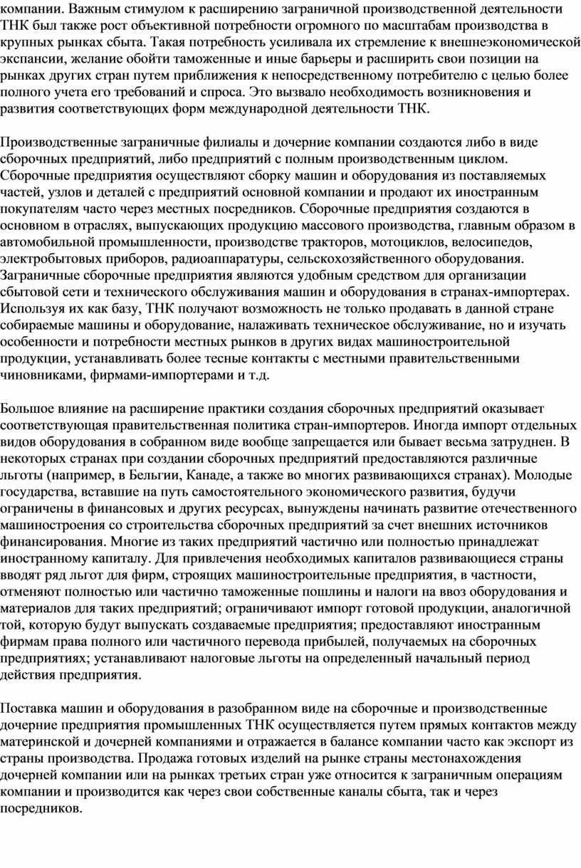 Производственные заграничные филиалы и дочерние компании создаются либо в виде сборочных предприятий, либо предприятий с полным производственным циклом. Сборочные предприятия осуществляют сборку машин и оборудования из поставляемых частей, узлов и деталей с предприятий основной компании и продают их иностранным покупателям часто через местных посредников. Сборочные предприятия создаются в основном в отраслях, выпускающих продукцию массового производства, главным образом в автомобильной промышленности, производстве тракторов, мотоциклов, велосипедов, электробытовых приборов, радиоаппаратуры, сельскохозяйственного оборудования. Заграничные сборочные предприятия являются удобным средством для организации сбытовой сети и технического обслуживания машин и оборудования в странах-импортерах. Используя их как базу, ТНК получают возможность не только продавать в данной стране собираемые машины и оборудование, налаживать техническое обслуживание, но и изучать особенности и потребности местных рынков в других видах машиностроительной продукции, устанавливать более тесные контакты с местными правительственными чиновниками, фирмами-импортерами и т.д.
