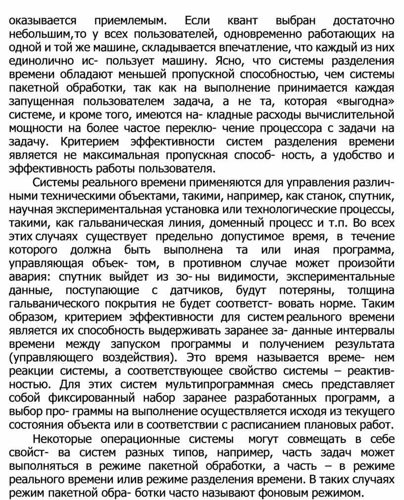 Некоторые операционные системы могут совмещать в себе свойст- ва систем разных типов, например, часть задач может выполняться в режиме пакетной обработки, а часть – в режиме реального времени или в режиме разделения времени. В таких случаях режим пакетной обра- ботки часто называют фоновым режимом.