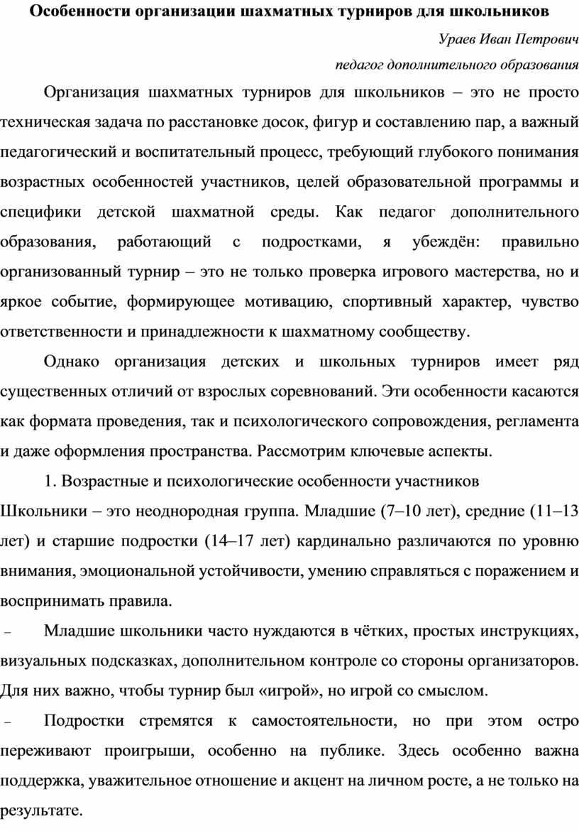 Организация шахматных турниров для школьников – это не просто техническая задача по расстановке досок, фигур и составлению пар, а важный педагогический и воспитательный процесс, требующий глубокого понимания возрастных особенностей участников, целей образовательной программы и специфики детской шахматной среды. Как педагог дополнительного образования, работающий с подростками, я убеждён: правильно организованный турнир – это не только проверка игрового мастерства, но и яркое событие, формирующее мотивацию, спортивный характер, чувство ответственности и принадлежности к шахматному сообществу.