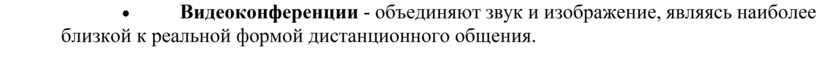 · Видеоконференции - объединяют звук и изображение, являясь наиболее близкой к реальной формой дистанционного общения.
