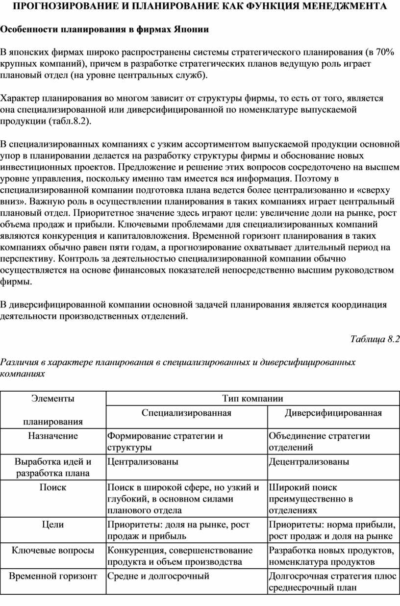 Характер планирования во многом зависит от структуры фирмы, то есть от того, является она специализированной или диверсифицированной по номенклатуре выпускаемой продукции (табл.8.2).
