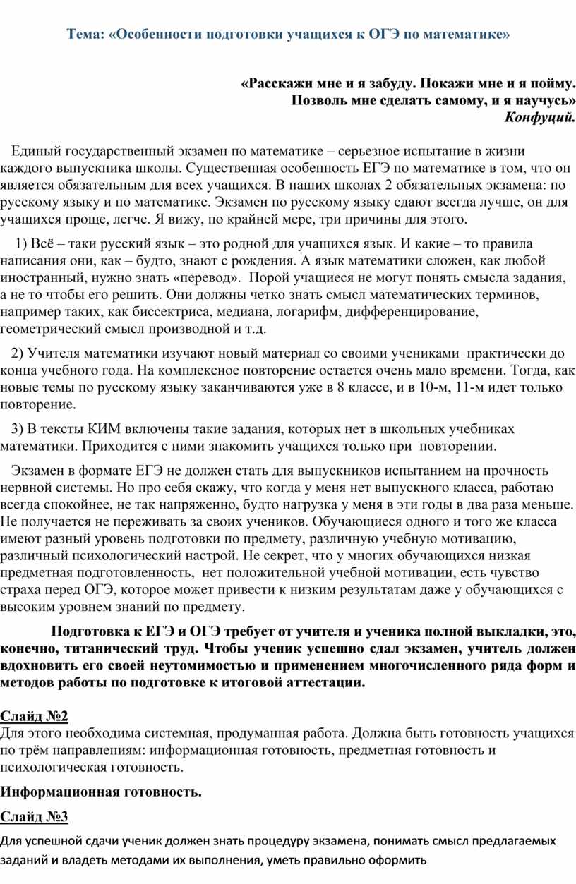Тема: «Особенности подготовки учащихся к ОГЭ по математике»