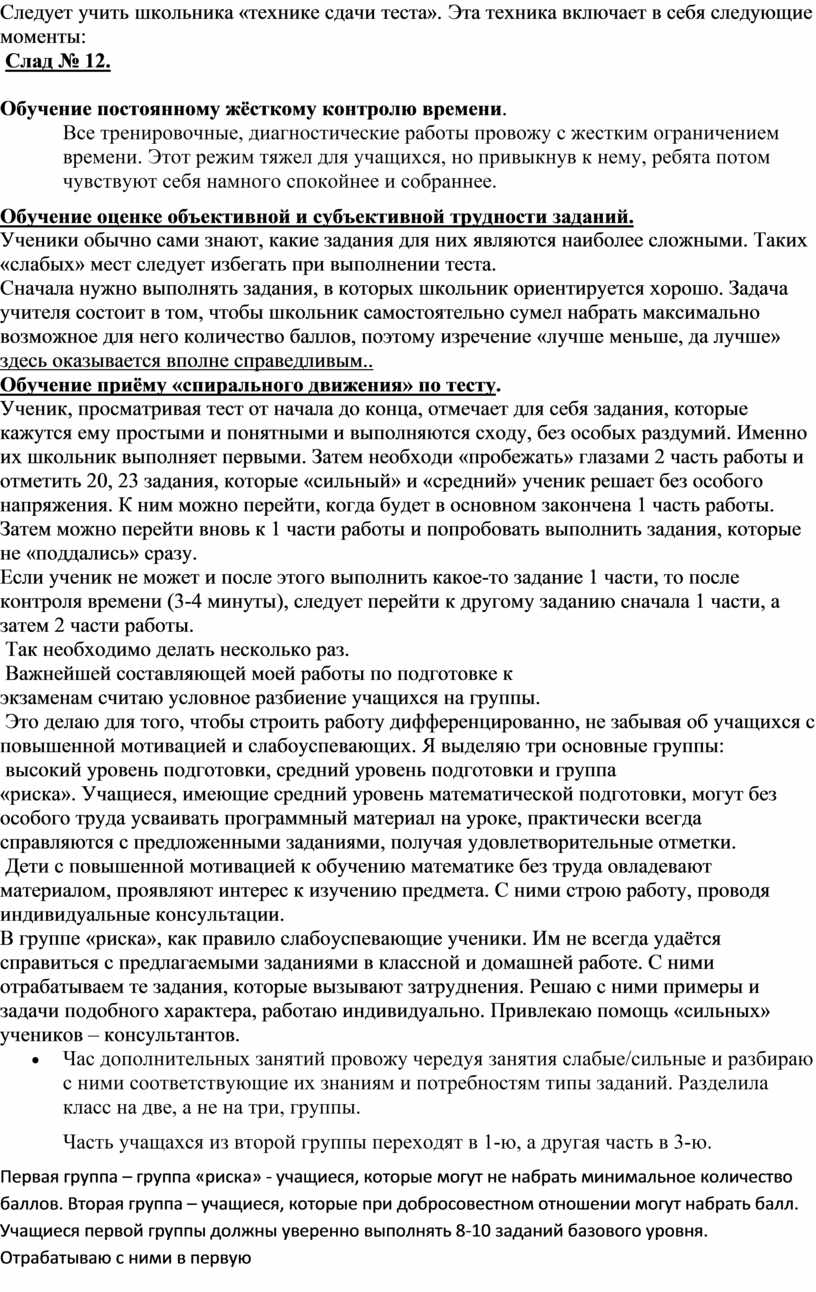 Все тренировочные, диагностические работы провожу с жестким ограничением времени. Этот режим тяжел для учащихся, но привыкнув к нему, ребята потом чувствуют себя намного спокойнее и собраннее.