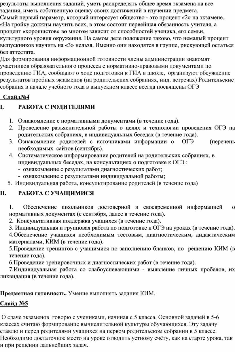 Для формирования информационной готовности члены администрации знакомят участников образовательного процесса с нормативно-правовыми документами по проведению ГИА, сообщают о ходе подготовки к ГИА в школе, организуют обсуждение результатов пробных экзаменов (на родительских собраниях, инд. встречах) Родительские собрания в начале учебного года в выпускном классе всегда посвящены ОГЭ