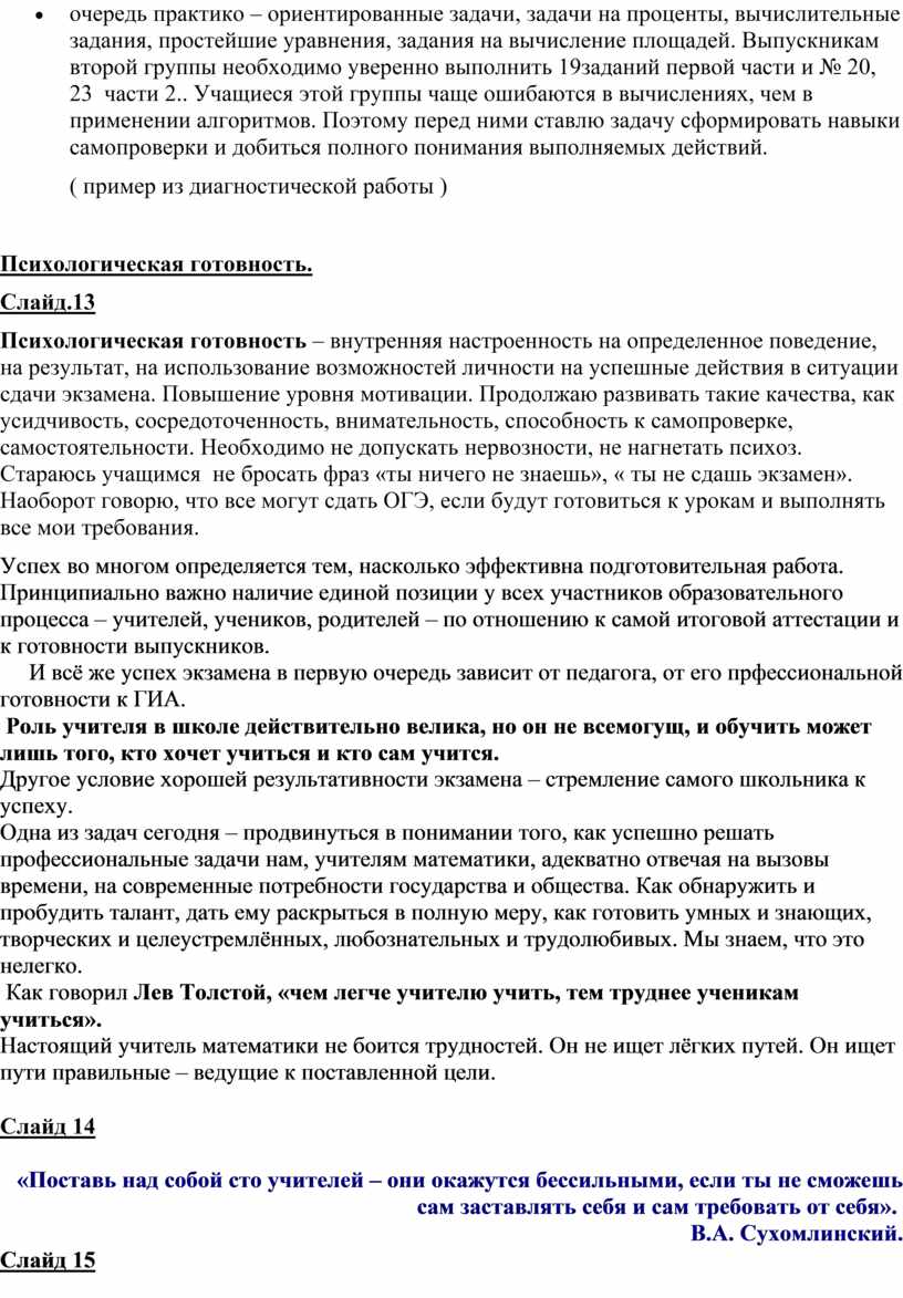 Психологическая готовность – внутренняя настроенность на определенное поведение, на результат, на использование возможностей личности на успешные действия в ситуации сдачи экзамена. Повышение уровня мотивации. Продолжаю развивать такие качества, как усидчивость, сосредоточенность, внимательность, способность к самопроверке, самостоятельности. Необходимо не допускать нервозности, не нагнетать психоз. Стараюсь учащимся не бросать фраз «ты ничего не знаешь», « ты не сдашь экзамен». Наоборот говорю, что все могут сдать ОГЭ, если будут готовиться к урокам и выполнять все мои требования.