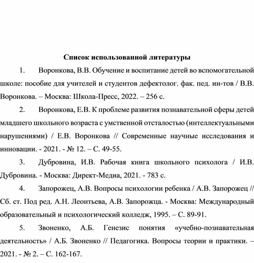 1. Воронкова, В.В. Обучение и воспитание детей во вспомогательной школе: пособие для учителей и студентов дефектолог. фак. пед. ин-тов / В.В. Воронкова. – Москва: Школа-Пресс, 2022. – 256 с.