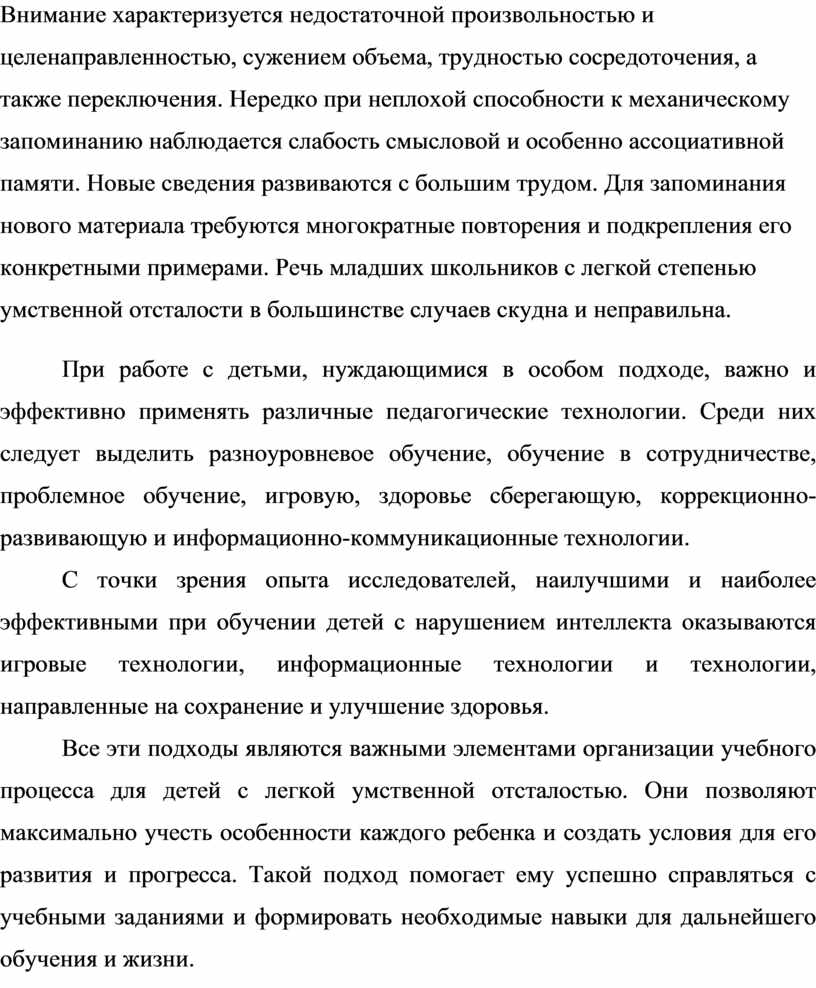 Все эти подходы являются важными элементами организации учебного процесса для детей с легкой умственной отсталостью. Они позволяют максимально учесть особенности каждого ребенка и создать условия для его развития и прогресса. Такой подход помогает ему успешно справляться с учебными заданиями и формировать необходимые навыки для дальнейшего обучения и жизни.