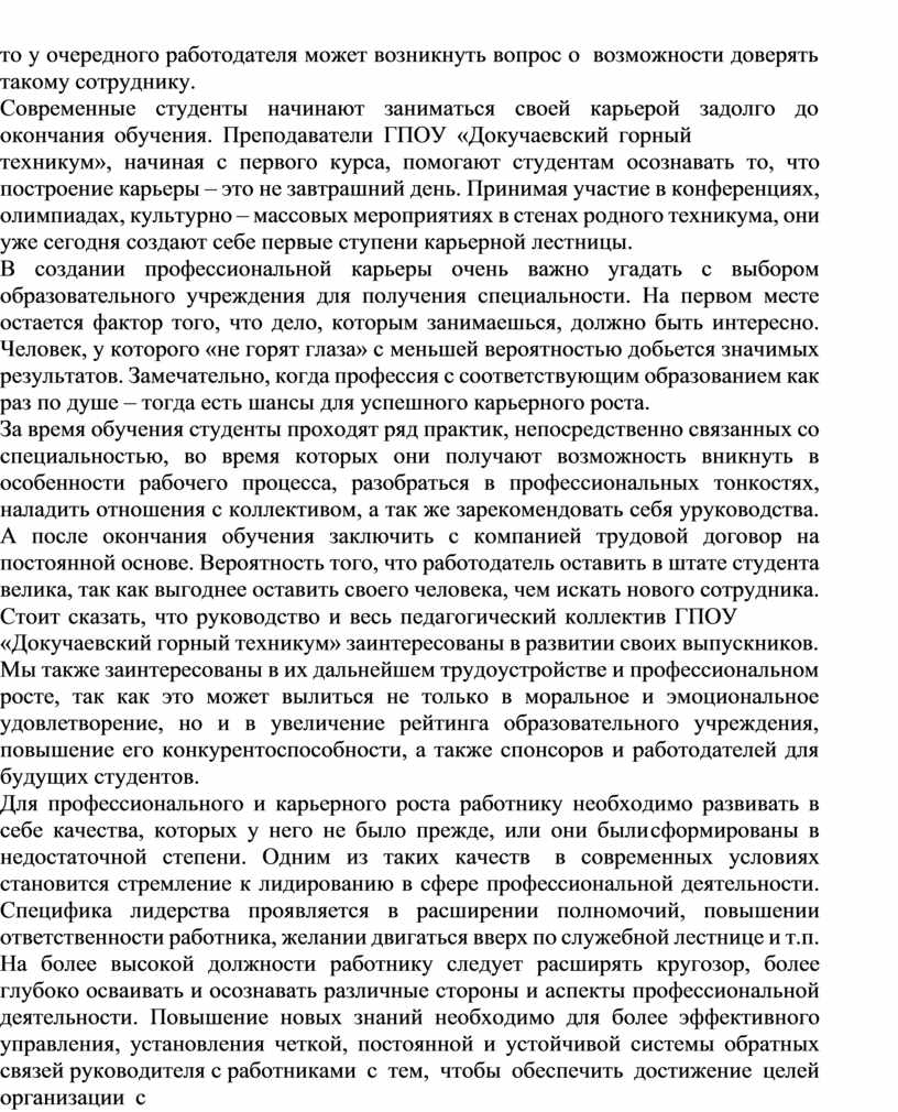 «Докучаевский горный техникум» заинтересованы в развитии своих выпускников. Мы также заинтересованы в их дальнейшем трудоустройстве и профессиональном росте, так как это может вылиться не только в моральное и эмоциональное удовлетворение, но и в увеличение рейтинга образовательного учреждения, повышение его конкурентоспособности, а также спонсоров и работодателей для будущих студентов.