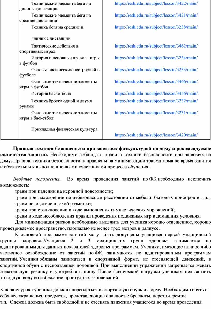 Вводные положения. Во время проведения занятий по ФК необходимо исключить возможность: травм при падении на неровной поверхности; травм при нахождении на небезопасном расстоянии от мебели, бытовых приборов и т.п.; травм вследствие плохой разминки; травм при столкновении в ходе выполнения гимнастических упражнений; травм в ходе несоблюдения правил проведения подвижных игр в домашних условиях. Для минимизации рисков необходимо выделить для ученика хорошо освещенное, хорошо проветриваемое пространство, площадью не менее трех метров в радиусе. К основной программе занятий могут быть допущены учащиеся первой медицинской группы здоровья. Учащиеся 2 и 3 медицинских групп здоровья занимаются по адаптированным для данных показателей здоровья программам. Ученики, имеющие полное либо частичное освобождение от занятий по ФК, занимаются по адаптированным программам занятий. Ученики обязаны заниматься в спортивной форме, не стесняющей движений, в спортивной обуви с нескользящей подошвой. При выполнении упражнений запрещается жевать жевательную резинку и употреблять пищу. После физической нагрузки ученикам нельзя пить холодную воду во избежание простудных заболеваний.