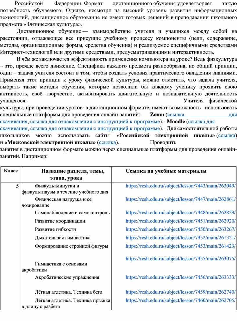 В современной системе образования значимая роль отводится направлению дистанционного обучения. Учащиеся, находясь в режиме дистанционного обучения, имеют возможность получения полноценного образования в соответствии с законодательством Российской Федерации. Формат дистанционного обучения удовлетворяет такую потребность обучаемого. Однако, несмотря на высокий уровень развития информационных технологий, дистанционное образование не имеет готовых решений в преподавании школьного предмета «Физическая культура». Дистанционное обучение — взаимодействие учителя и учащихся между собой на расстоянии, отражающее все присущие учебному процессу компоненты (цели, содержание, методы, организационные формы, средства обучения) и реализуемое специфичными средствами Интернет-технологий или другими средствами, предусматривающими интерактивность. В чём же заключается эффективность применения компьютера на уроке? Ведь физкультура – это, прежде всего движение. Специфика каждого предмета разнообразна, но общий принцип, один – задача учителя состоит в том, чтобы создать условия практического овладения знаниями. Применяя этот принцип к уроку физической культуры, можно отметить, что задача учителя, выбрать такие методы обучения, которые позволили бы каждому ученику проявить свою активность, своё творчество, активизировать двигательную и познавательную деятельность учащегося. Учителя физической культуры, при проведении уроков в дистанционном формате, имеют возможность использовать специальные платформы для проведения онлайн-занятий: Zoom (ссылка для скачивания, ссылка для ознакомления с инструкцией к программе). Moodle (ссылка для скачивания, ссылка для ознакомления с инструкцией к программе). Для самостоятельной работы школьников можно использовать сайты «Российской электронной школы» (ссылка) и «Московской электронной школы» (ссылка). Проводить занятия в дистанционном формате можно через специальные платформы для проведения онлайн-занятий. Например: