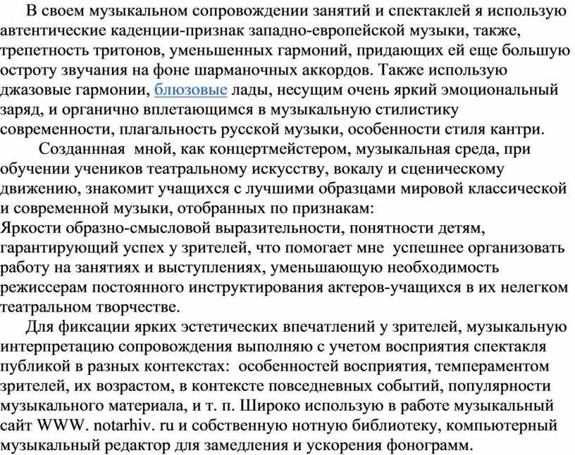 Созданнная мной, как концертмейстером, музыкальная среда, при обучении учеников театральному искусству, вокалу и сценическому движению, знакомит учащихся с лучшими образцами мировой классической и современной музыки, отобранных по признакам: