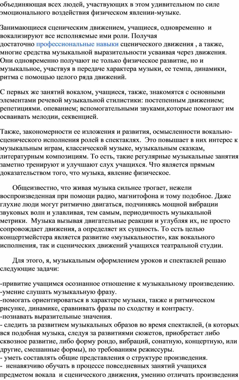 Также, закономерности ее изложения и развития, осмысленности вокально-сценического исполнения ролей в спектаклях. Это повышает в них интерес к музыкальным играм, классической музыке, музыкальным сказкам, литературным композициям. То есть, такие регулярные музыкальные занятия заметно тренируют и улучшают слух учащихся. Что является прямым доказательством того, что музыка, явление физическое.