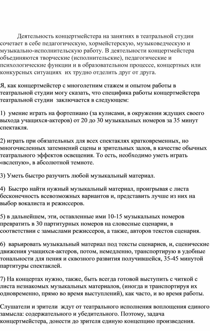 Деятельность концертмейстера на занятиях в театральной студии сочетает в себе педагогическую, хормейстерскую, музыковедческую и музыкально-исполнительскую работу. В деятельности концертмейстера объединяются творческие (исполнительские), педагогические и психологические функции и в образовательном процессе, концертных или конкурсных ситуациях их трудно отделить друг от друга.