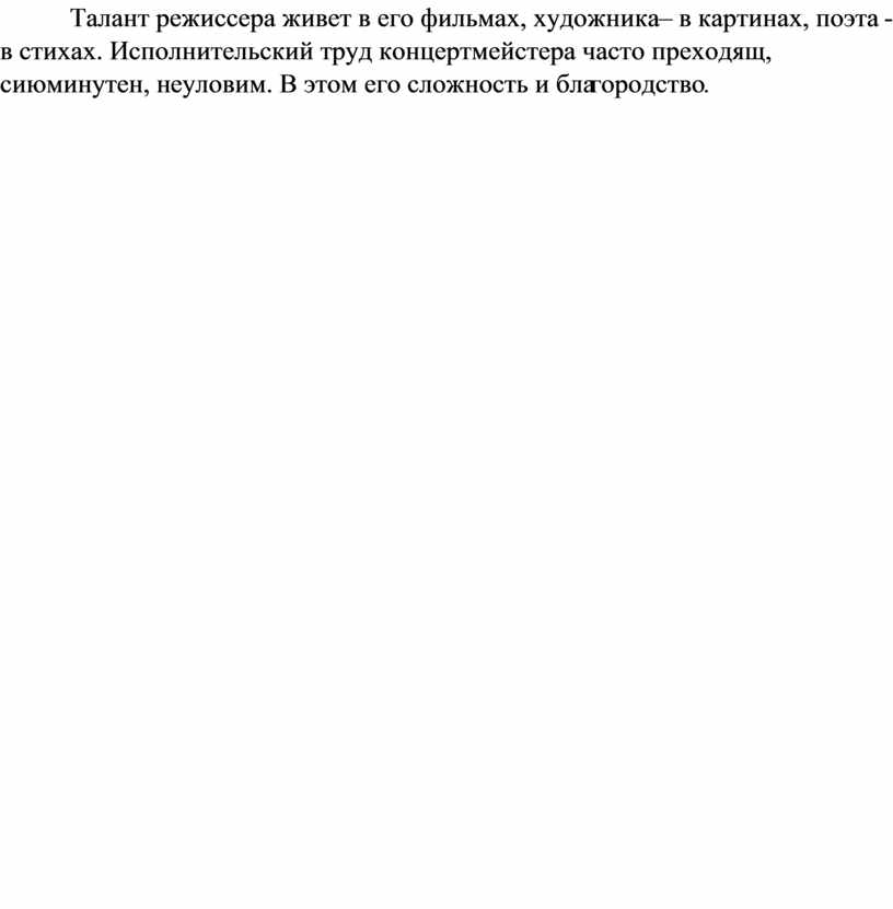 Талант режиссера живет в его фильмах, художника – в картинах, поэта - в стихах. Исполнительский труд концертмейстера часто преходящ, сиюминутен, неуловим. В этом его сложность и благородство.