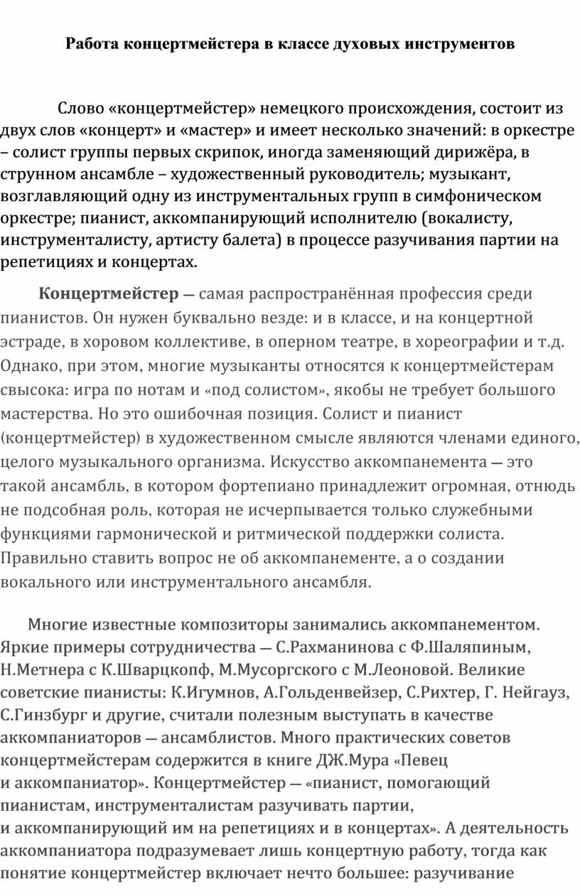 Работа концертмейстера многогранна. Она заключает в себе как творческую, так и педагогическую деятельность. Специфика работы концертмейстера в классах деревянных духовых инструментов требует от него особого универсализма, мобильности. Без профессионального концертмейстера не может быть грамотного, хорошего исполнения произведения. Концертмейстеру приходится приспосабливаться к творческой манере многих преподавателей, в классах которых он работает. Многообразие требований повышает его профессиональную компетентность. Концертмейстер должен быть готов ко всему: всевозможным импровизациям, подсказке забытого слова, подыгрыванию мелодии (если солист не держит тональность), проведению урока с учеником без преподавателя по специальности.