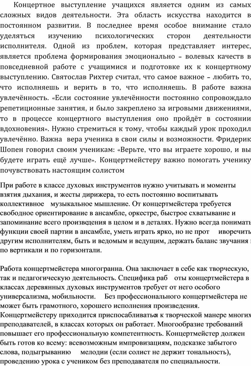 Концертное выступление учащихся является одним из самых сложных видов деятельности. Эта область искусства находится в постоянном развитии. В последнее время особое внимание стало уделяться изучению психологических сторон деятельности исполнителя. Одной из проблем, которая представляет интерес, является проблема формирования эмоционально – волевых качеств в повседневной работе с учащимися и подготовке их к концертному выступлению. Святослав Рихтер считал, что самое важное – любить то, что исполняешь и верить в то, что исполняешь. В работе важна увлечённость. «Если состояние увлечённости постоянно сопровождало репетиционные занятия, и было закреплено за игровыми движениями, то в процессе концертного выступления оно пройдёт в состоянии вдохновения». Нужно стремиться к тому, чтобы каждый урок проходил увлечённо. Важна вера ученика в свои силы и возможности. Фридерик Шопен говорил своим ученикам: «Верьте, что вы играете хорошо, и вы будете играть ещё лучше». Концертмейстеру важно помогать ученику почувствовать настоящим солистом