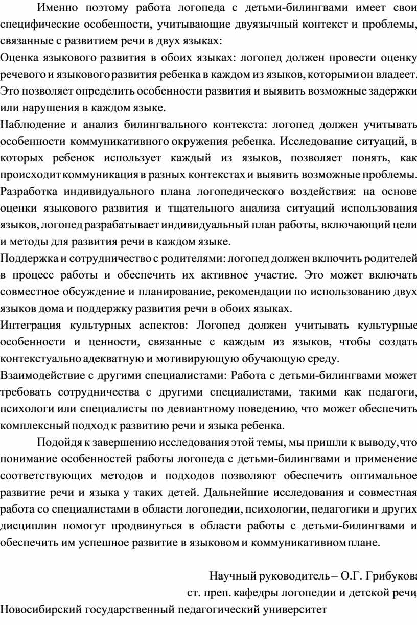 Подойдя к завершению исследования этой темы, мы пришли к выводу, что понимание особенностей работы логопеда с детьми-билингвами и применение соответствующих методов и подходов позволяют обеспечить оптимальное развитие речи и языка у таких детей. Дальнейшие исследования и совместная работа со специалистами в области логопедии, психологии, педагогики и других дисциплин помогут продвинуться в области работы с детьми-билингвами и обеспечить им успешное развитие в языковом и коммуникативном плане.