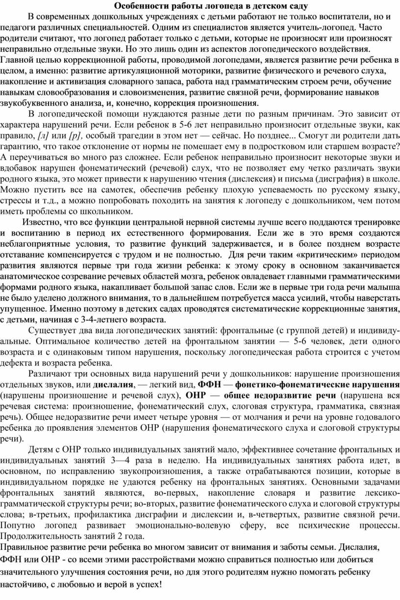 В современных дошкольных учреждениях с детьми работают не только воспитатели, но и педагоги различных специальностей. Одним из специалистов является учитель-логопед. Часто родители считают, что логопед работает только с детьми, которые не произносят или произносят неправильно отдельные звуки. Но это лишь один из аспектов логопедического воздействия. Главной целью коррекционной работы, проводимой логопедами, является развитие речи ребенка в целом, а именно: развитие артикуляционной моторики, развитие физического и речевого слуха, накопление и активизация словарного запаса, работа над грамматическим строем речи, обучение навыкам словообразования и словоизменения, развитие связной речи, формирование навыков звукобуквенного анализа, и, конечно, коррекция произношения.
