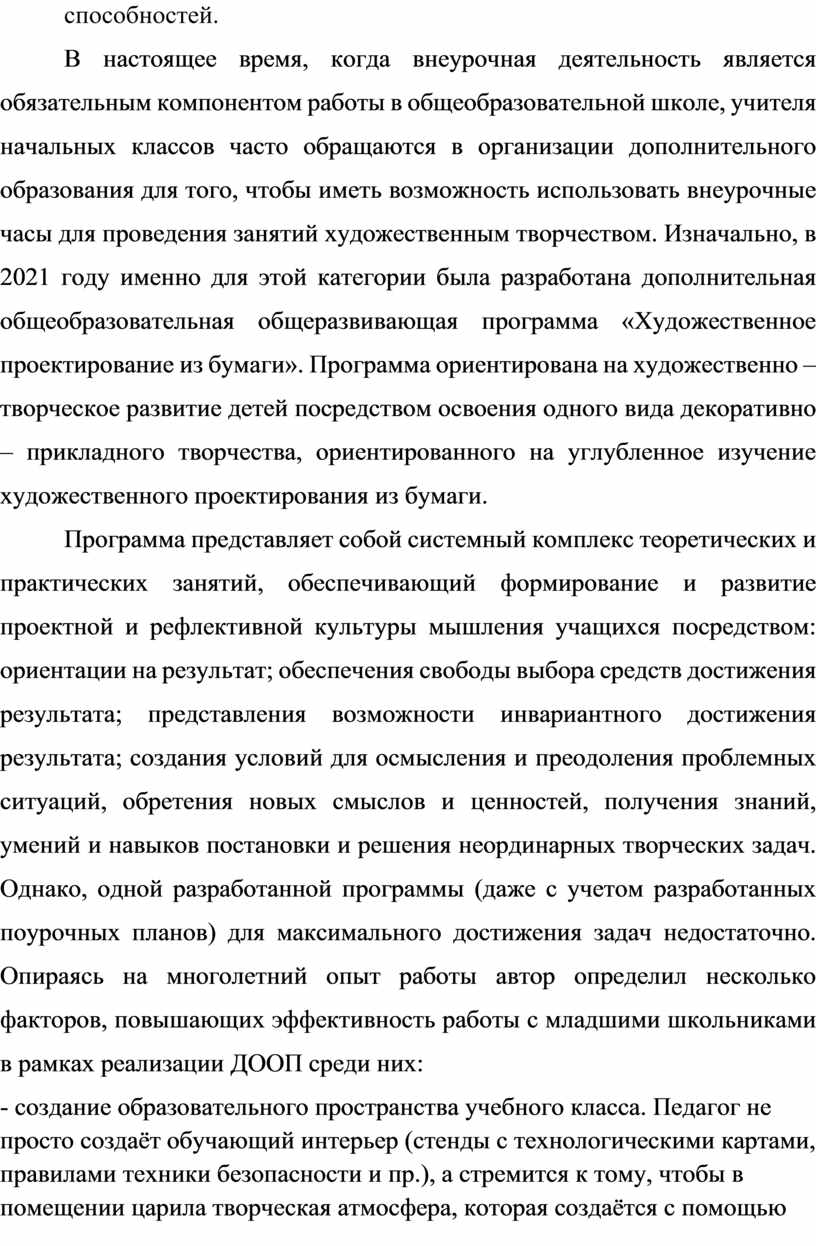 В настоящее время, когда внеурочная деятельность является обязательным компонентом работы в общеобразовательной школе, учителя начальных классов часто обращаются в организации дополнительного образования для того, чтобы иметь возможность использовать внеурочные часы для проведения занятий художественным творчеством. Изначально, в 2021 году именно для этой категории была разработана дополнительная общеобразовательная общеразвивающая программа «Художественное проектирование из бумаги». Программа ориентирована на художественно – творческое развитие детей посредством освоения одного вида декоративно – прикладного творчества, ориентированного на углубленное изучение художественного проектирования из бумаги.