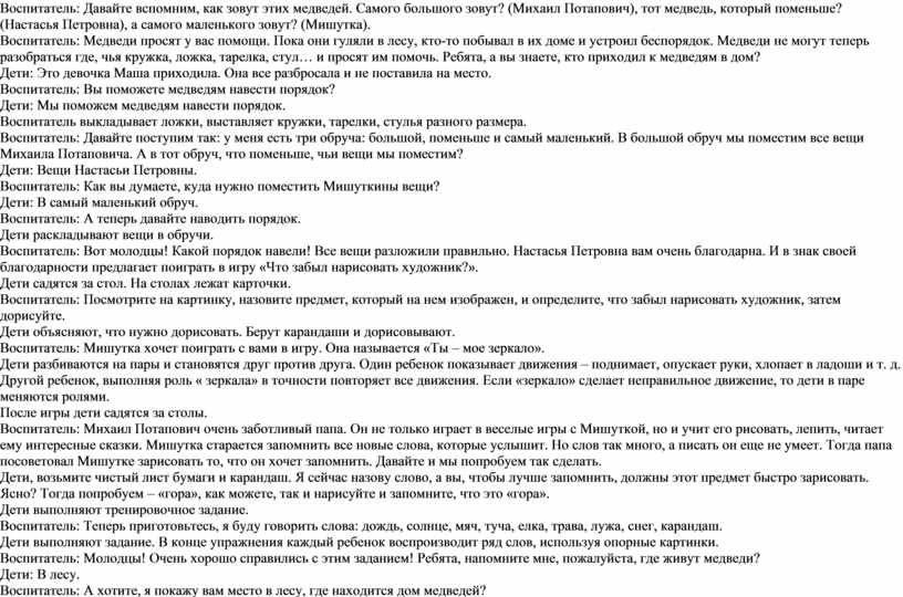 Воспитатель: Давайте вспомним, как зовут этих медведей. Самого большого зовут? (Михаил Потапович), тот медведь, который поменьше? (Настасья Петровна), а самого маленького зовут? (Мишутка).