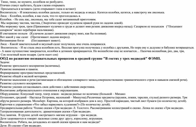 ООД по развитию познавательных процессов в средней группе "В гостях у трех медведей" ФЭМП.