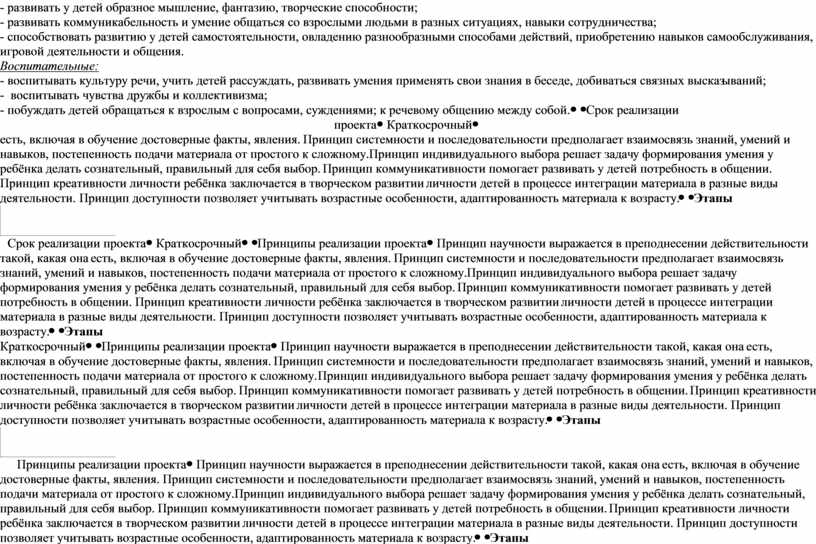 Принцип научности выражается в преподнесении действительности такой, какая она есть, включая в обучение достоверные факты, явления. Принцип системности и последовательности предполагает взаимосвязь знаний, умений и навыков, постепенность подачи материала от простого к сложному. Принцип индивидуального выбора решает задачу формирования умения у ребёнка делать сознательный, правильный для себя выбор. Принцип коммуникативности помогает развивать у детей потребность в общении. Принцип креативности личности ребёнка заключается в творческом развитии личности детей в процессе интеграции материала в разные виды деятельности. Принцип доступности позволяет учитывать возрастные особенности, адаптированность материала к возрасту. |