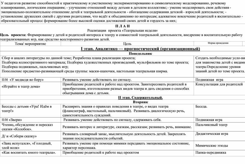 I этап. Аналитико — прогностический (организационный) Цели:Создать необходимые условия для знакомства детей с видами театра. Определение уровня знаний детей по теме проекта. Итоги этапа: II этап. Содержательный. Итоги этапа: Активное участие родителей в реализации проекта. Обогащенная развивающая среда. III. Итогово — аналитический (обобщающий) этап Цель: Анализ и подведение итогов проекта. |