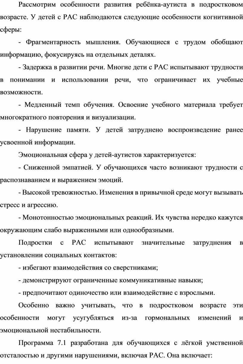 Программа 7.1 разработана для обучающихся с лёгкой умственной отсталостью и другими нарушениями, включая РАС. Она включает: