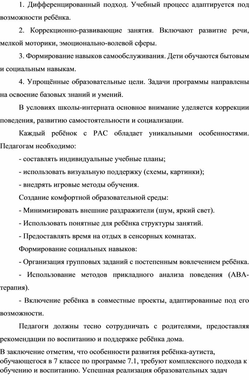 В заключение отметим, что особенности развития ребёнка-аутиста, обучающегося в 7 классе по программе 7.1, требуют комплексного подхода к обучению и воспитанию. Успешная реализация образовательных задач возможна только при условии создания индивидуализированной развивающей среды, применения коррекционно-развивающих методов и обеспечения эмоциональной поддержки ребёнка. Школа-интернат должна стать пространством, где ребёнок с РАС сможет преодолевать свои трудности, раскрывая свои способности и интегрируясь в общество.