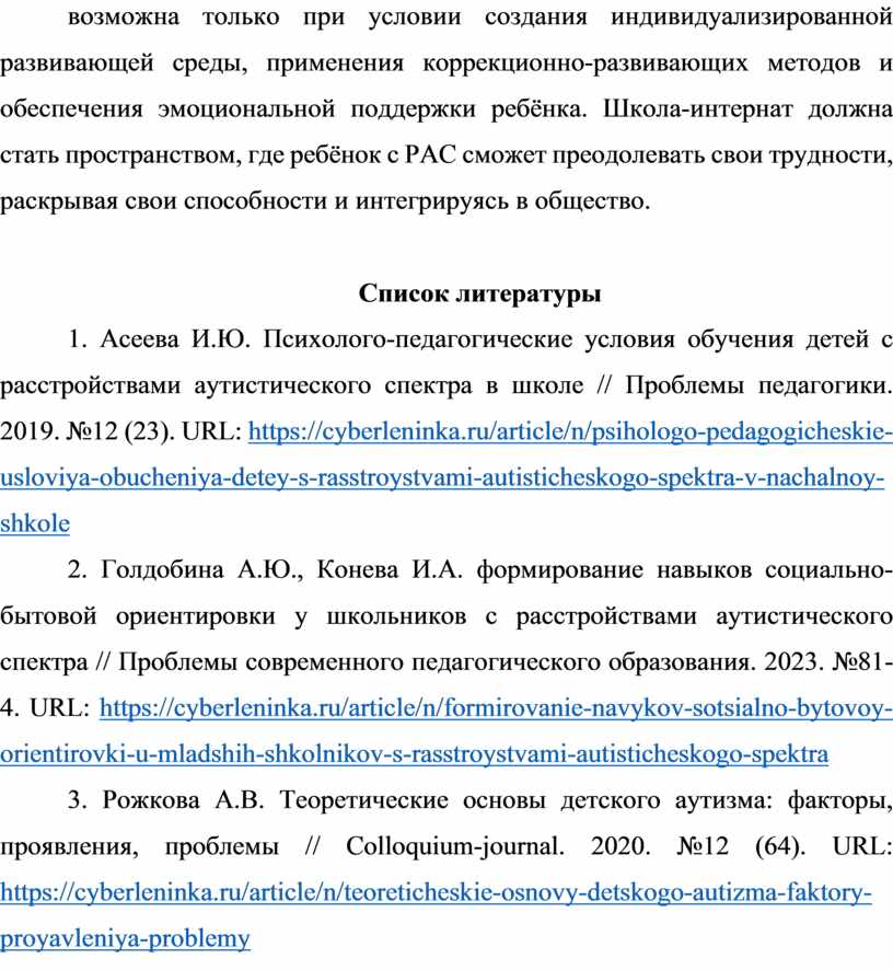 1. Асеева И.Ю. Психолого-педагогические условия обучения детей с расстройствами аутистического спектра в школе // Проблемы педагогики. 2019. №12 (23). URL: https://cyberleninka.ru/article/n/psihologo-pedagogicheskie-usloviya-obucheniya-detey-s-rasstroystvami-autisticheskogo-spektra-v-nachalnoy-shkole