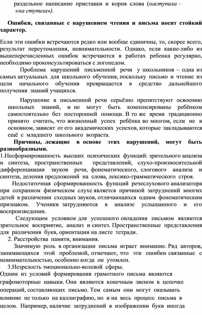 Значимую роль в организации письма играет внимание. Ряд авторов, занимающихся этой проблемой, отмечают, что эти ошибки связанные с невнимательностью, особенно когда он утомлен.
