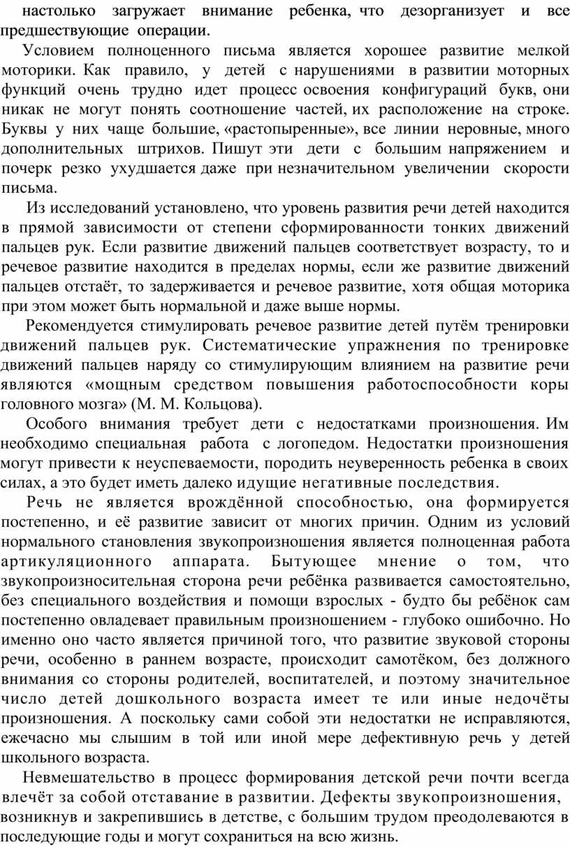 Условием полноценного письма является хорошее развитие мелкой моторики. Как правило, у детей с нарушениями в развитии моторных функций очень трудно идет процесс освоения конфигураций букв, они никак не могут понять соотношение частей, их расположение на строке. Буквы у них чаще большие, «растопыренные», все линии неровные, много дополнительных штрихов. Пишут эти дети с большим напряжением и почерк резко ухудшается даже при незначительном увеличении скорости письма.