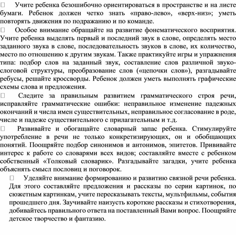 Развивайте и обогащайте словарный запас ребенка. Стимулируйте употребление в речи не только конкретизирующих, он и обобщающих понятий. Поощряйте подбор синонимов и антонимов, эпитетов. Прививайте интерес к работе со словарями всех видов; составляйте вместе с ребенком собственный «Толковый словарик». Разгадывайте загадки, учите ребенка объяснять смысл пословиц и поговорок.