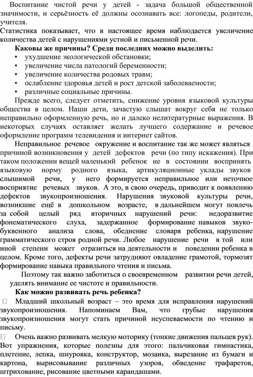 Поэтому так важно заботиться о своевременном развитии речи детей, уделять внимание ее чистоте и правильности.