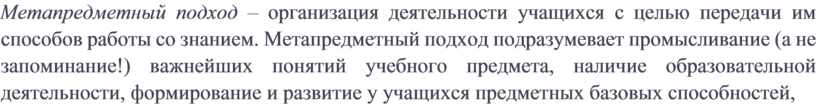Благодаря метапредметному подходу в обучении ребенок осваивает сразу два типа содержания – содержание предметной области и способы деятельности, которые являются универсальными, т.е. применимыми к различным предметным областям.
