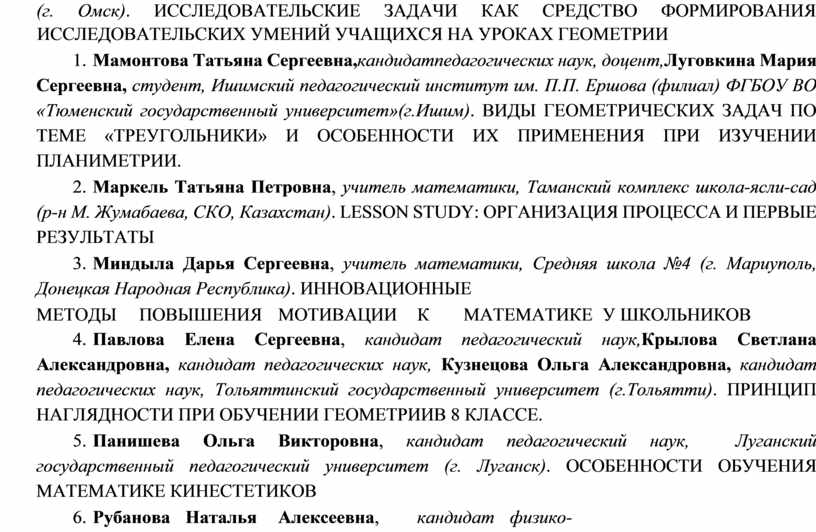 12. Мамонтова Татьяна Сергеевна,кандидатпедагогических наук, доцент,Луговкина Мария Сергеевна, студент, Ишимский педагогический институт им. П.П. Ершова (филиал) ФГБОУ ВО «Тюменский государственный университет»(г.Ишим). ВИДЫ ГЕОМЕТРИЧЕСКИХ ЗАДАЧ ПО ТЕМЕ «ТРЕУГОЛЬНИКИ» И ОСОБЕННОСТИ ИХ ПРИМЕНЕНИЯ ПРИ ИЗУЧЕНИИ ПЛАНИМЕТРИИ.