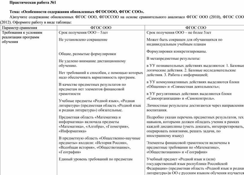 А)изучите содержание обновленных ФГОС ООО, ФГОССОО на основе сравнительного анализасо ФГОС ООО (2010), ФГОС СОО (2012). Оформите работу в виде таблицы: