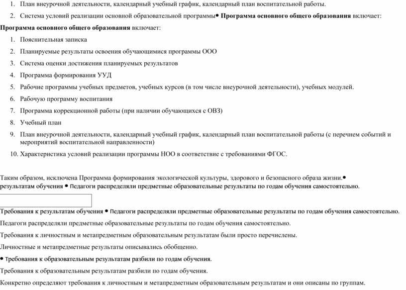 Программа основного общего образования включает: 1. Пояснительная записка 2. Планируемые результаты освоения обучающимися программы ООО 3. Система оценки достижения планируемых результатов 4. Программа формирования УУД 5. Рабочие программы учебных предметов, учебных курсов (в том числе внеурочной деятельности), учебных модулей. 6. Рабочую программу воспитания 7. Программа коррекционной работы (при наличии обучающихся с ОВЗ) 8. Учебный план 9. План внеурочной деятельности, календарный учебный график, календарный план воспитательной работы (с перечнем событий и мероприятий воспитательной направленности) 10. Характеристика условий реализации программы НОО в соответствие с требованиями ФГОС.