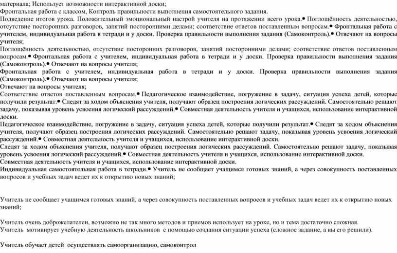Учитель не сообщает учащимся готовых знаний, а через совокупность поставленных вопросов и учебных задач ведет их к открытию новых знаний; Учитель очень доброжелателен, возможно не так много методов и приемов использует на уроке, но и тема достаточно сложная. Учитель мотивирует учебную деятельность школьников с помощью создания ситуации успеха (сложное задание, а вы его решили). Учитель обучает детей осуществлять самоорганизацию, самоконтроль и рефлексивную деятельность.