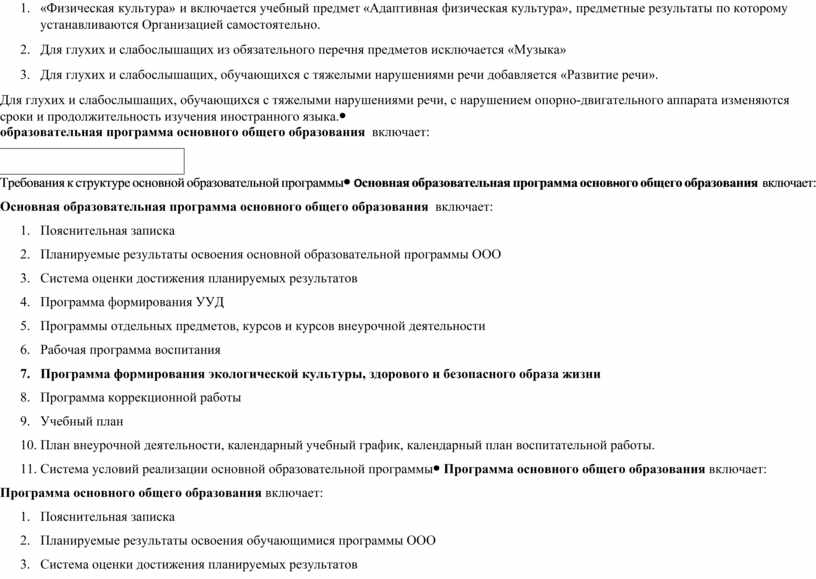 Основная образовательная программа основного общего образования включает: 1. Пояснительная записка 2. Планируемые результаты освоения основной образовательной программы ООО 3. Система оценки достижения планируемых результатов 4. Программа формирования УУД 5. Программы отдельных предметов, курсов и курсов внеурочной деятельности 6. Рабочая программа воспитания 7. Программа формирования экологической культуры, здорового и безопасного образа жизни 8. Программа коррекционной работы 9. Учебный план 10. План внеурочной деятельности, календарный учебный график, календарный план воспитательной работы. 11. Система условий реализации основной образовательной программы |
