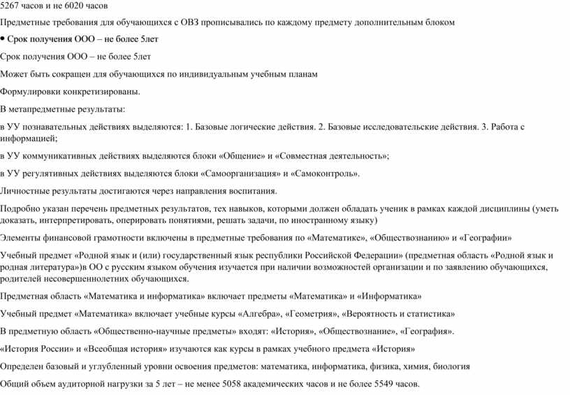 Срок получения ООО – не более 5лет Может быть сокращен для обучающихся по индивидуальным учебным планам Формулировки конкретизированы. В метапредметные результаты: в УУ познавательных действиях выделяются: 1. Базовые логические действия. 2. Базовые исследовательские действия. 3. Работа с информацией; в УУ коммуникативных действиях выделяются блоки «Общение» и «Совместная деятельность»; в УУ регулятивных действиях выделяются блоки «Самоорганизация» и «Самоконтроль». Личностные результаты достигаются через направления воспитания. Подробно указан перечень предметных результатов, тех навыков, которыми должен обладать ученик в рамках каждой дисциплины (уметь доказать, интерпретировать, оперировать понятиями, решать задачи, по иностранному языку) Элементы финансовой грамотности включены в предметные требования по «Математике», «Обществознанию» и «Географии» Учебный предмет «Родной язык и (или) государственный язык республики Российской Федерации» (предметная область «Родной язык и родная литература»)в ОО с русским языком обучения изучается при наличии возможностей организации и по заявлению обучающихся, родителей несовершеннолетних обучающихся. Предметная область «Математика и информатика» включает предметы «Математика» и «Информатика» Учебный предмет «Математика» включает учебные курсы «Алгебра», «Геометрия», «Вероятность и статистика» В предметную область «Общественно-научные предметы» входят: «История», «Обществознание», «География». «История России» и «Всеобщая история» изучаются как курсы в рамках учебного предмета «История» Определен базовый и углубленный уровни освоения предметов: математика, информатика, физика, химия, биология Общий объем аудиторной нагрузки за 5 лет – не менее 5058 академических часов и не более 5549 часов. В качестве общесистемных требований к реализации программы основного общего образования рассмотрены вопросы организации дистанционного образования. Предметные требования едины для всех обучающихся. Особенности получения образования лиц с ОВЗ установлены следующие: