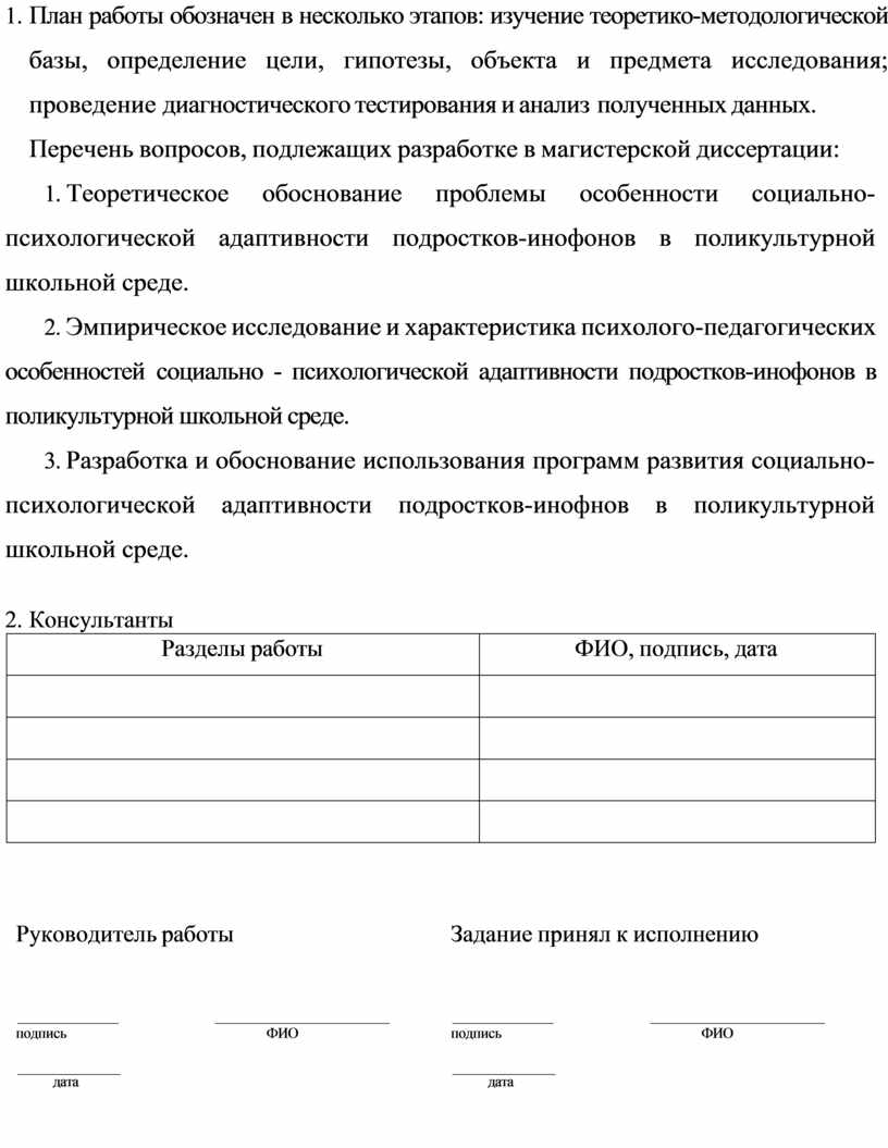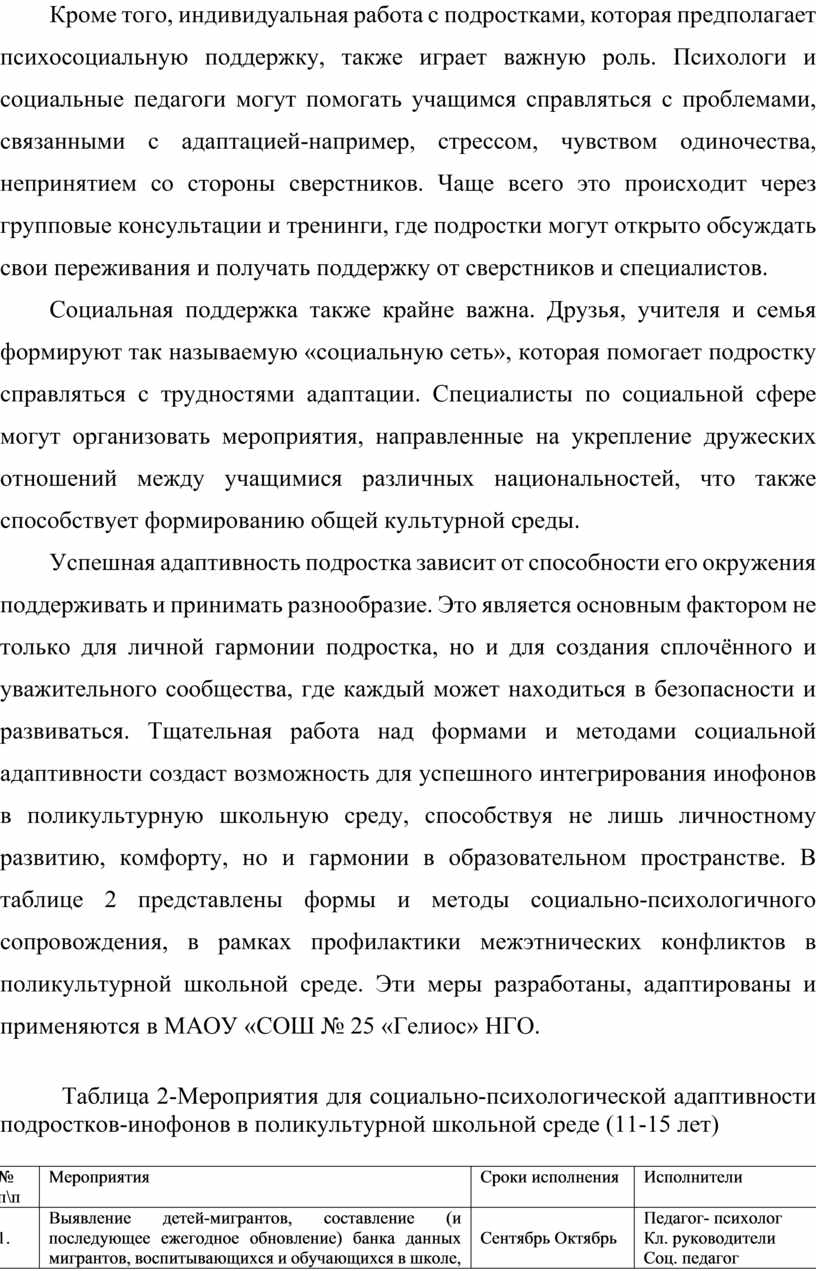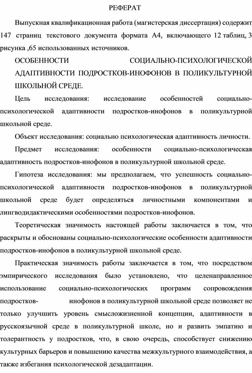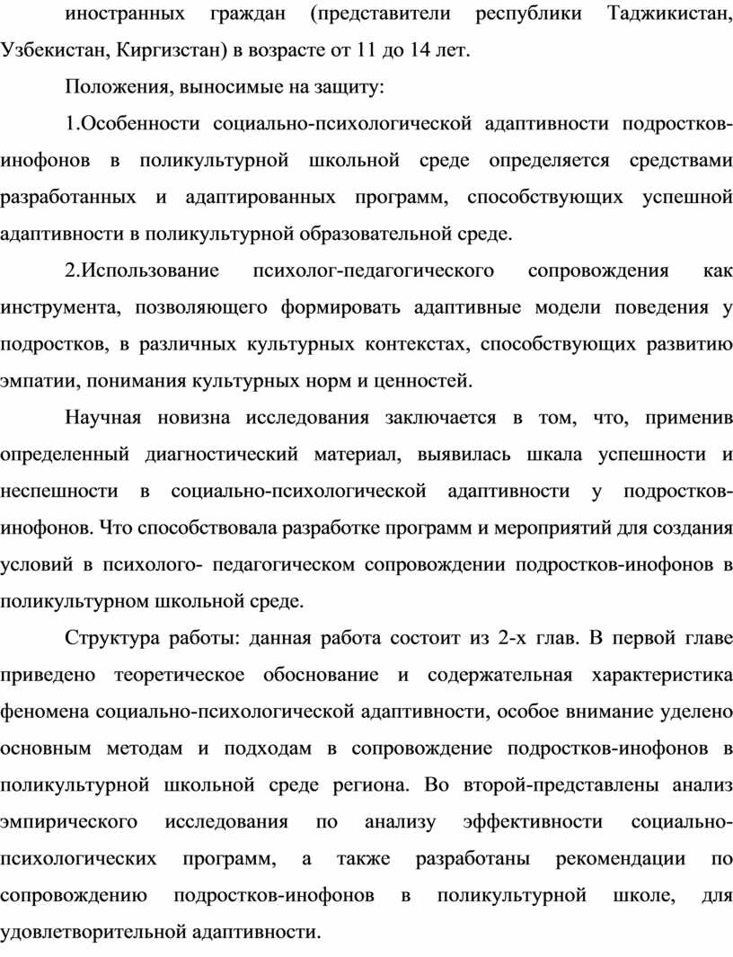 Тема работы: Особенности социально-психологической адаптивности подростков-инофонов в поликультурной школьной среде