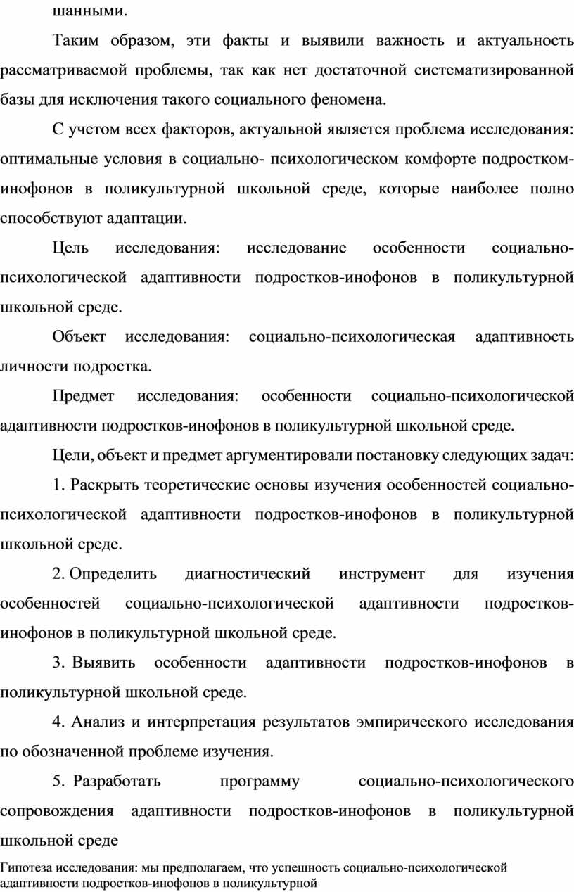 Предмет исследования: особенности социально-психологическая адаптивность подростков-инофонов в поликультурной школьной среде.