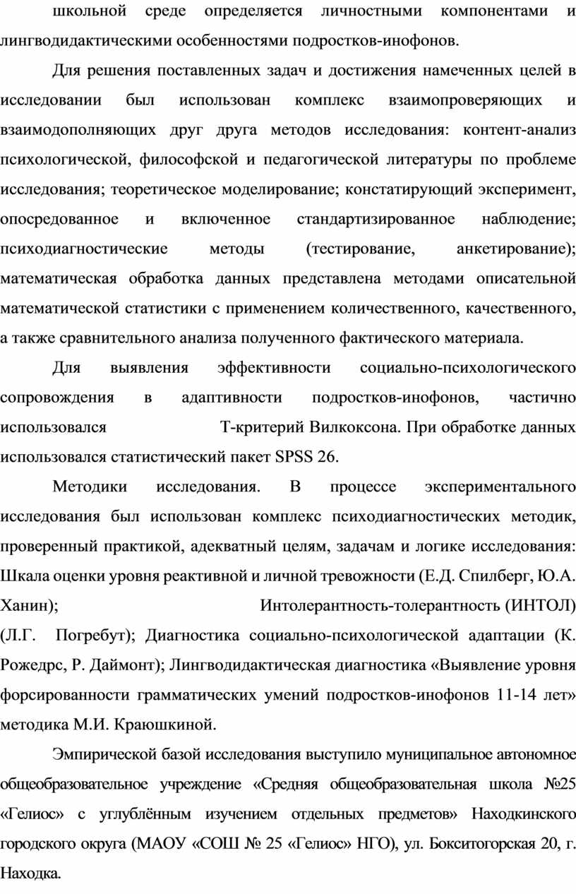 2. Диагностический инструментарий: Шкала оценки уровня реактивной и личной тревожности (Е.Д. Спилберг, Ю.А. Ханин); Интолерантность-толерантность (ИНТОЛ) (Л.Г. Погребут); Диагностика социально- психологической адаптации (К. Рожедрс, Р. Даймонт); Лингводидактическая диагностика «Выявление уровня форсированности грамматических умений подростков-инофонов 11-14 лет» методика М.И. Краюшкиной.