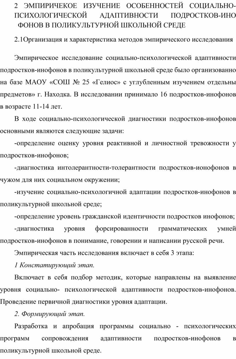 2. Эмпирическое исследование и характеристика психолого-педагогических особенностей социально - психологической адаптивности подростков-инофонов в поликультурной школьной среде.