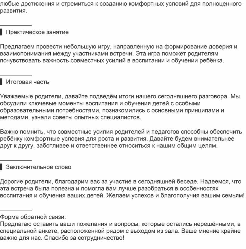Уважаемые родители, давайте подведём итоги нашего сегодняшнего разговора. Мы обсудили ключевые моменты воспитания и обучения детей с особыми образовательными потребностями, познакомились с основными принципами и методами, узнали советы опытных специалистов.