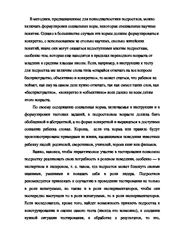 Перейдем от описания особенностей развития мышления подростков к обсуждению вопросов, связанных с их психодиагностикой. Отметим главное: к подросткам — коль скоро они уже не дети, но еще и не взрослые — необходим особый ппсиходиагностический подход, учитывающий как их детские, так взрослые черты. По уровню своего интеллектуального развития подростки не намного уступают взрослым людям, поэтому, изучая их познавательные процессы, вполне уже можно применять тесты, предназначенные для взрослых людей, с ограничениями, которые касаются в основном только специальных, научных термины и понятий.