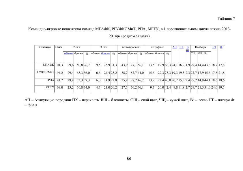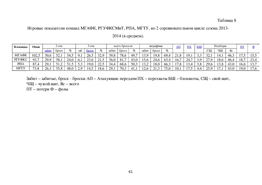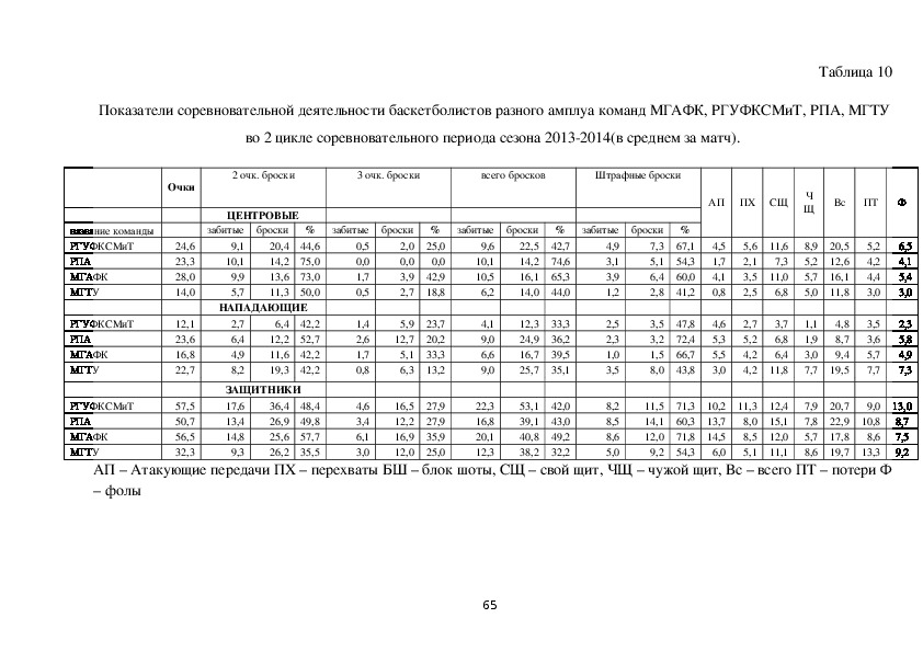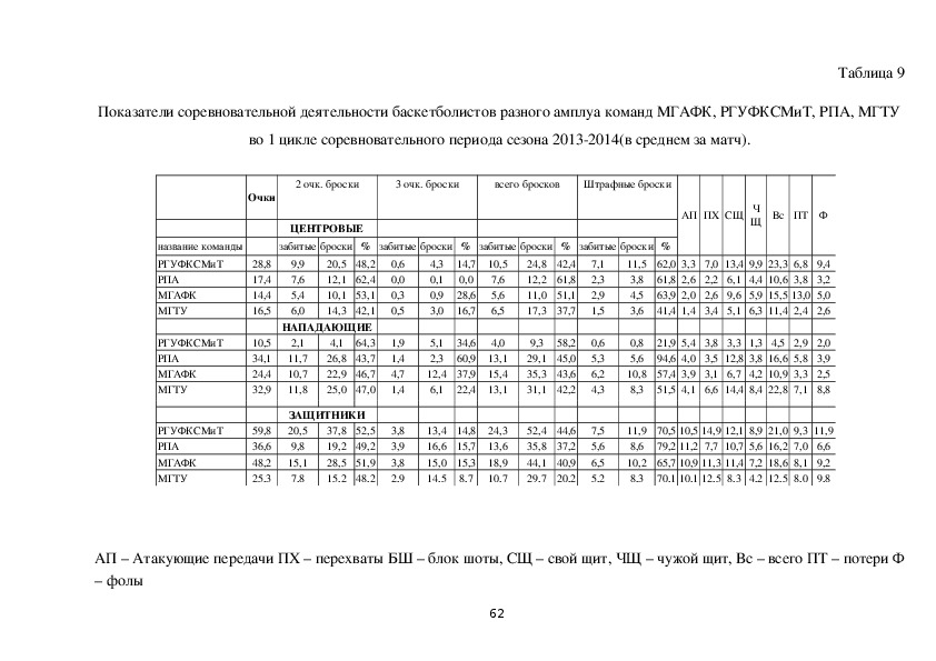 АП – Атакующие передачи ПХ – перехваты БШ – блок шоты, СЩ – свой щит, ЧЩ – чужой щит, Вс – всего ПТ – потери Ф