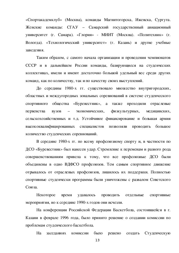 Отмечая активность ВУЗов в развитии студенческого баскетбола на текущем этапе, следует указать, что система подготовки студенческих команд основывается главным образом на теоретических и методических положениях, разработанных для детско-юношеского баскетбола и команд высокой квалификации. Но следует сказать, что система подготовки студентов должна строиться с учетом особенностей организации учебного процесса Вузов, а значит, имеет свою специфику. Об этом говорится в Концепции развития студенческого баскетбола в России, разработанной в АСБ (39), а также в работах таких авторов как Гзовский Б.М., Кудряшов, 1973г., Рапопорт Л.А., 2001г, Соколов Н.Г., 2008 г., Радмилка, 2010 г., Матыцин О.В. 2013г., Никонов Д.Н.,2011г., Лаптев С.О.,2011г.