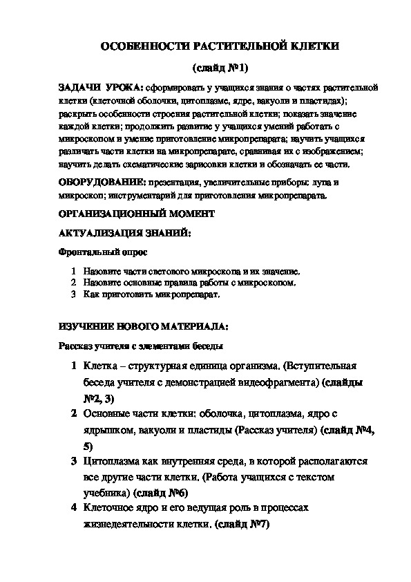 ЗАДАЧИ УРОКА: сформировать у учащихся знания о частях растительной клетки (клеточной оболочки, цитоплазме, ядре, вакуоли и пластидах); раскрыть особенности строения растительной клетки; показать значение каждой клетки; продолжить развитие у учащихся умений работать с микроскопом и умение приготовление микропрепарата; научить учащихся различать части клетки на микропрепарате, сравнивая их с изображением; научить делать схематические зарисовки клетки и обозначать ее части.